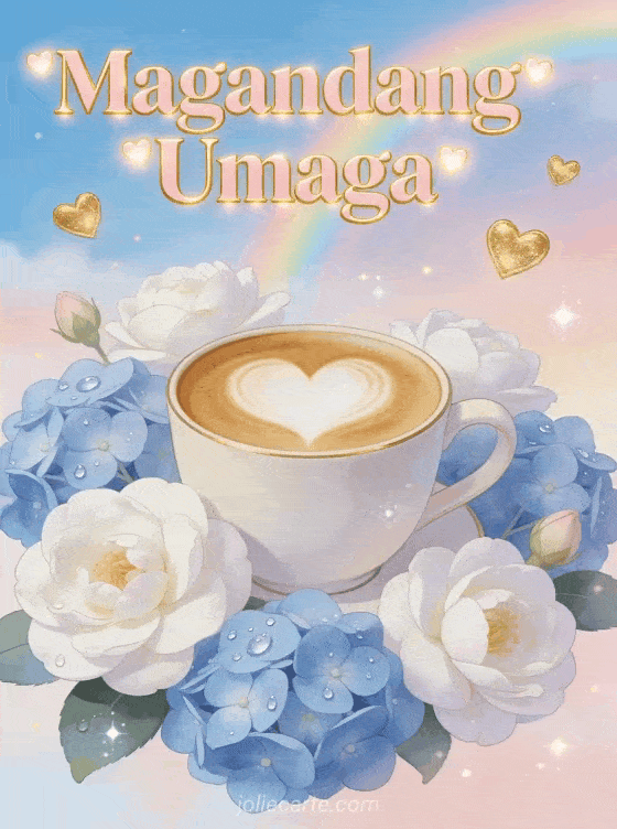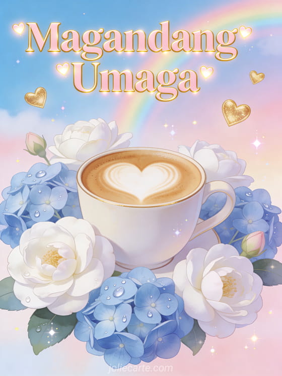 Simulan ang araw gamit ang romantikong card na ito na may latte art heart cup na napapalibutan ng puting camellia at asul na hydrangea, pastel na bahaghari at gintong puso na lumutang. Tuklasin din ang isang good morning coffee GIF o isang good morning coffee image.