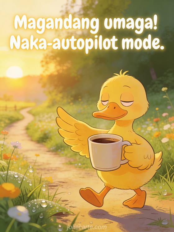 Simulan ang araw na may ngiti sa pamamagitan ng pagpapadala ng nakakatawang magandang umaga card na ito. Isang dilaw na bibe ang naglalakad na halos natutulog na hawak ang isang malaking tasa ng kape, perpektong kinakatawan ang autopilot mode sa umaga. Tuklasin din ang nakakatawang kape sa umaga card o ang magandang umaga card na may humor.