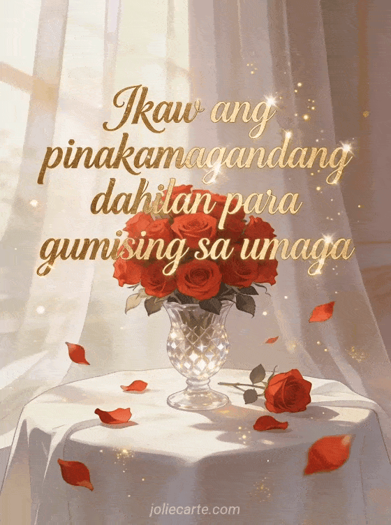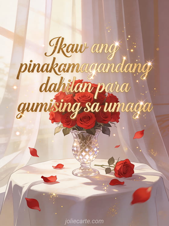 Sorpresahin ang iyong mahal sa magandang good morning card na puno ng pagmamahal. Pulang rosas sa kristal na plorera at gintong cursive na letra para ipahayag ang iyong nararamdaman. Tuklasin din ang isang mapagmahal na good morning card o isang romantikong good morning mensahe.