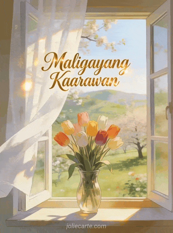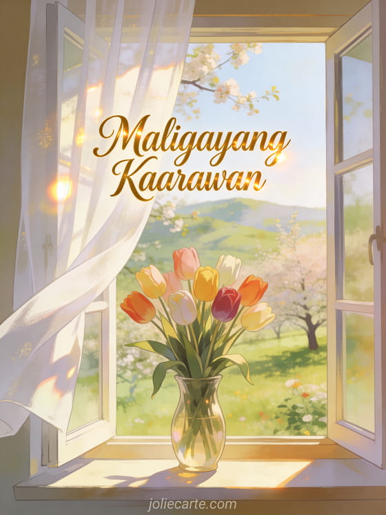 Batiin siya ng maligayang kaarawan gamit ang mapayapang card na ito na may plorera ng tulip sa bintana na may puting kurtina at tagsibol na tanawin sa gintong liwanag. Tuklasin din ang isang eleganteng card ng kaarawan na may champagne o isang card ng kaarawan na may paru-paro.