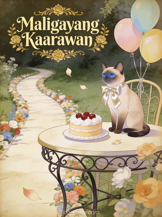 Batiin siya ng maligayang kaarawan gamit ang elegant na vintage card na ito na may siamese na pusa sa tabi ng cake na may cherry sa landas ng kanayunan. Tuklasin din ang isang nakakatawang card ng kaarawan para sa kanya o isang maligayang kaarawan card para sa kanya.