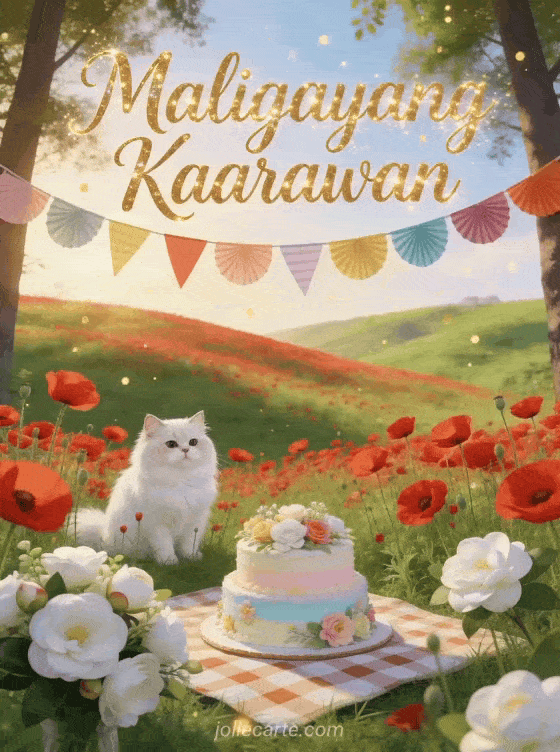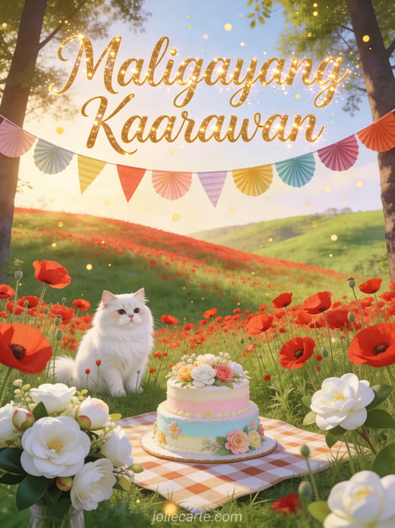 Ipagdiwang ang isang kaarawan gamit ang kaibig-ibig na bukiring card na ito na nagpapakita ng puting Persian na pusa na nakaupo sa gitna ng mga pulang poppy sa berdeng burol, puting camellia, makukulay na mga banderita, cake na may bulaklak sa checkered na mantel at gintong particle sa mainit na liwanag. Tuklasin din ang animated na birthday card o isang birthday card na may lumang kotse.