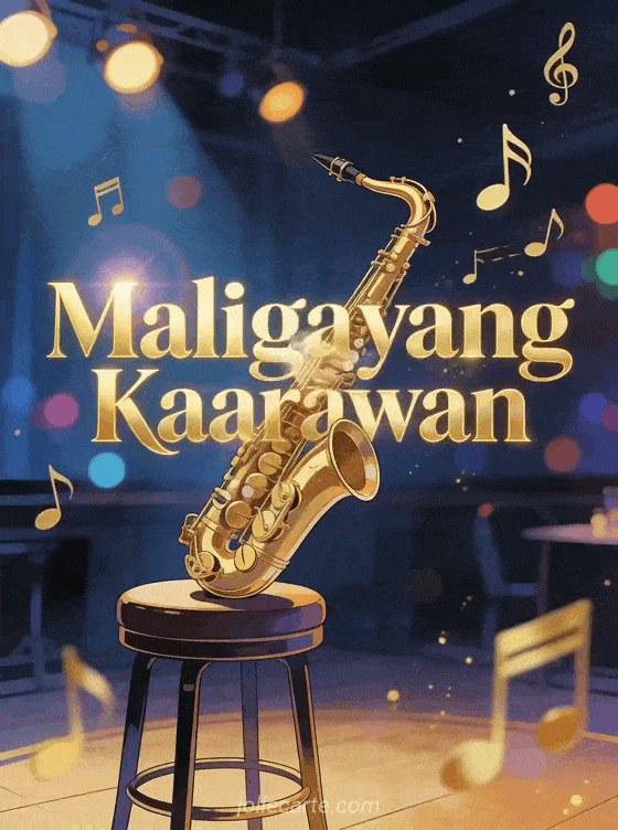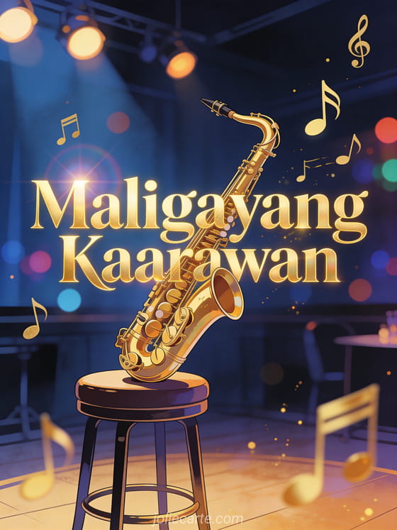 Ipagdiwang ang isang kaarawan gamit ang eleganteng card na ito na nagpapakita ng gintong saxophone sa isang upuan sa jazz club, asul na liwanag, mainit na mga spotlight, gintong nota ng musika na lumutang sa hangin at makukulay na bokeh. Tuklasin din ang birthday card para sa lalaki o isang birthday card na may pusa.