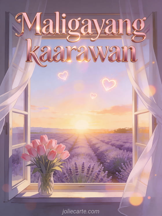 Ipagdiwang ang isang romantikong kaarawan gamit ang magandang card na ito na nagpapakita ng bukas na bintana na nakaharap sa mga taniman ng lavender sa paglubog ng araw, isang bouquet ng rosas na tulips sa bintana, puting kurtina na umaalon sa hangin at mga kumikislap na puso sa kalangitan. Tuklasin din ang birthday card ng pag-ibig o isang romantikong anibersaryo card.
