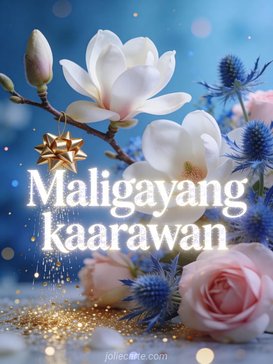 Ipagdiwang ang isang kaarawan gamit ang eleganteng card na ito na may puti at pink na magnolia na may asul na thistle, gintong sparkles na bumubuhos mula sa langit, at gintong gift bow na nakasabit sa sanga ng magnolia. Tuklasin din ang kaarawan card para sa lalaki o ang eleganteng kaarawan card.