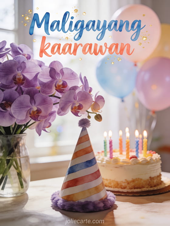 Ipagdiwang ang isang kaarawan gamit ang magandang photorealistic card na ito na may magandang bouquet ng purple na orkidyas na may striped party hat, isang decorated cake na may makulay na kandila, at pastel na mga lobo sa malambot na natural na ilaw. Tuklasin din ang kaarawan card para sa batang babae o ang kaarawan card para sa bata.