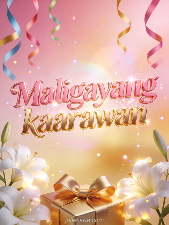 Ipagdiwang ang isang espesyal na kaarawan gamit ang nakakatuwa na card na ito na may maliwanag na puting lilyo na napapalibutan ng makulay na streamers at gintong gift bow sa isang kumikinang na pink at gintong background. Tuklasin din ang mahiwagang kaarawan card o ang cute na kaarawan ecard.