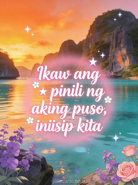 Sabihin sa kanya na iniisip mo siya gamit ang malambot na romantikong card na ito na may lagon ng El Nido sa Palawan sa paglubog ng araw na may lila na bulaklak at mga bituin. Tuklasin din ang isang card na iniisip kita nang sobra mahal ko o isang card na iniisip kita na may halik.
