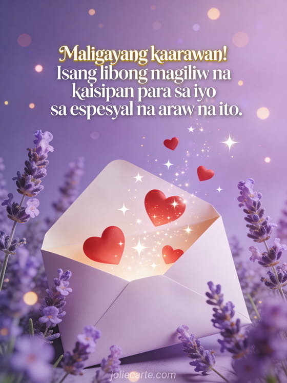Ipadala ang makatang kaarawan card na may magiliw na mensahe at bukas na sobre na naglalabas ng pulang puso at kumikinang na bituin na napapaligiran ng lavender sa malambot na lilang background. Tuklasin din ang isang card ng mensahe ng maligayang kaarawan o isang card ng teksto ng kaarawan.