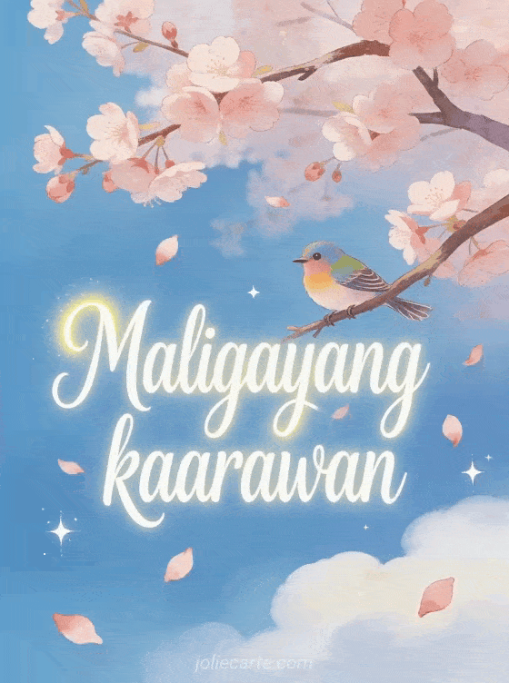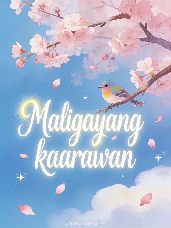 Ipadala ang makatang kaarawan card para kay Nanay na may makulay na ibon na nakapatong sa sanga ng namumulaklak na puno ng seresa na may nahuhulog na rosas na talulot sa ilalim ng malambot na asul na kalangitan. Tuklasin din ang isang card ng maligayang kaarawan para kay Nanay o isang mensahe ng kaarawan para kay Nanay.