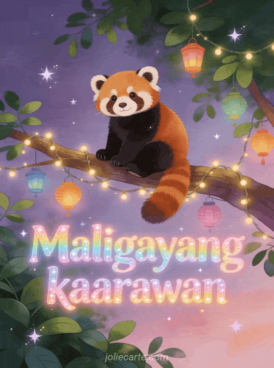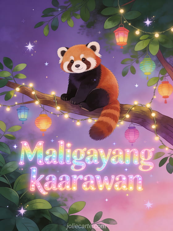 Magpadala ng kahanga-hangang karta ng kaarawan na may adorable na red panda na nakaupo sa isang sanga na may mga ilaw at makulay na lampion, napapalibutan ng lunting mga dahon at kumikislap na mga bituin sa takipsilim. Tuklasin din ang karta ng maligayang kaarawan o karta ng pagbati ng kaarawan.