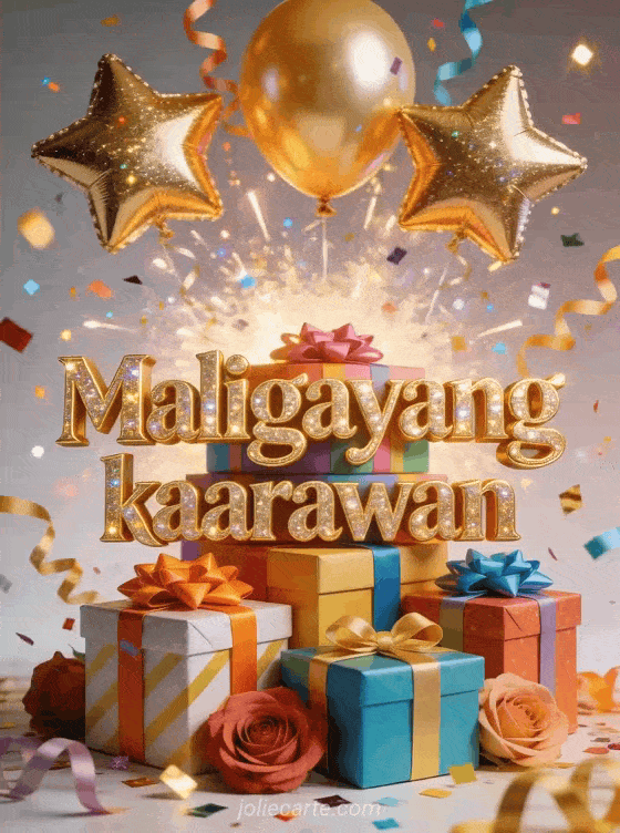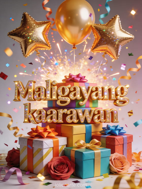 Magpadala ng pampiyestang karta ng kaarawan na may mga nakatumpok na regalo na may makulay na tali, mga gintong at rosas na lobo na hugis bituin, pagsabog ng confetti at kinang. Tuklasin din ang karta ng kaarawan para sa nanay o virtual na karta ng kaarawan para sa nanay.