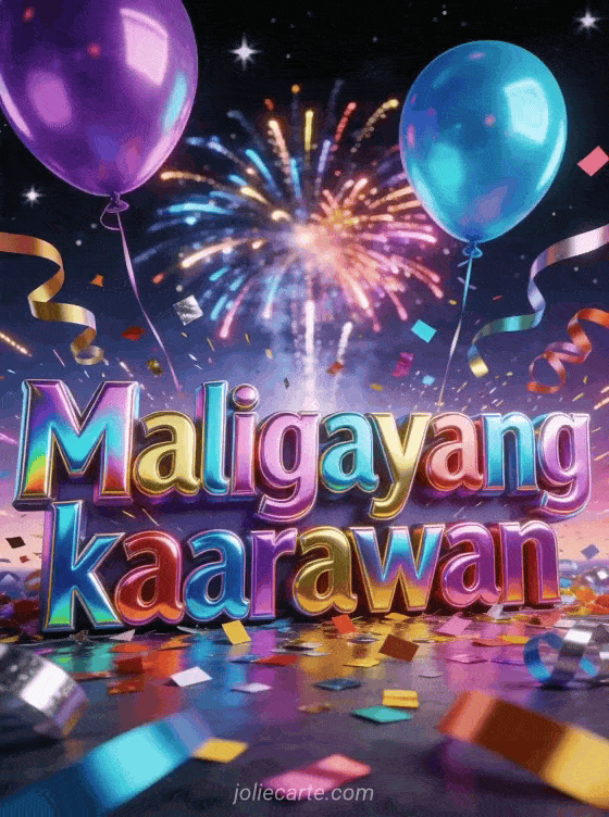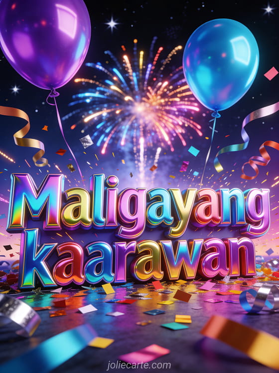 Magdiwang gamit ang masigla na kaarawan card na ito na may holographic 3D multicolored letters, metallic confetti explosion at streamers sa starry night sky na may makulay na paputok at neon violet at electric blue balloons. Tuklasin din ang kaarawan gif para sa teenager o ang kaarawan card na may teksto para sa teenager.