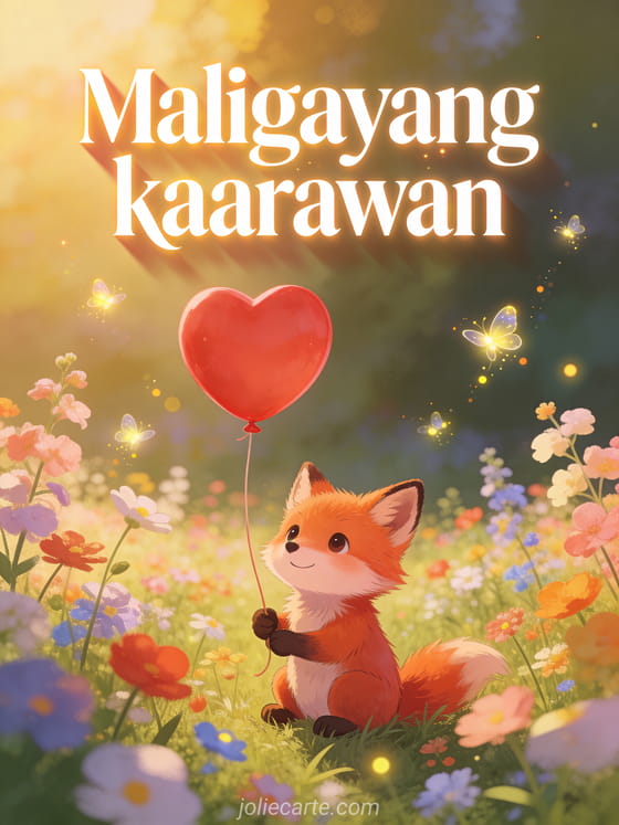 Ipagdiwang ang isang kaarawan gamit ang makatang card na ito na may adorable na munting pulang soro na nakaupo sa makulay na spring flower field, may hawak na pulang heart balloon na may gintong liwanag at kumikislap na alitaptap. Tuklasin din ang maligayang kaarawan nanay gif o ang kaarawan card mula sa anak para sa nanay.