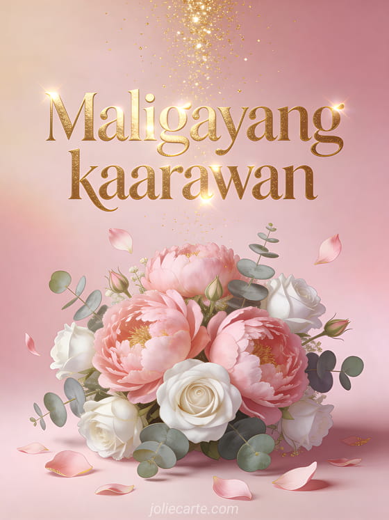 Ipagdiwang ang kaarawan ng kapatid na babae gamit ang eleganteng card na ito na may maringal na arrangement ng pink peonies, white roses at eucalyptus na may gintong glitter na bumubuhos sa delicate pink background. Tuklasin din ang kaarawan card para sa kapatid na babae o ang teksto ng kaarawan para sa kapatid na babae.