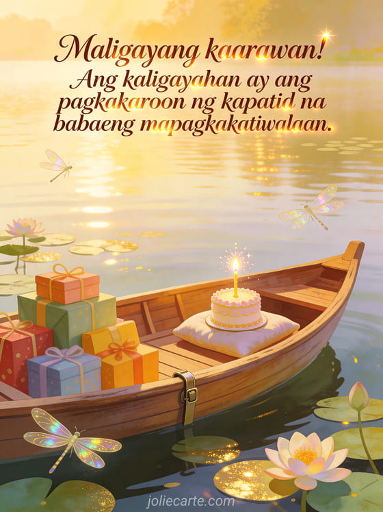 Ipagdiwang ang kaarawan ng kapatid na babae gamit ang makatang card na ito na may bangkang kahoy sa tahimik na lawa na may water lilies, makulay na mga regalo at eleganteng birthday cake na may kumikislap na kandila sa gintong liwanag ng umaga. Tuklasin din ang kaarawan card para sa kapatid na babae o ang kaarawan card para sa kapatid.