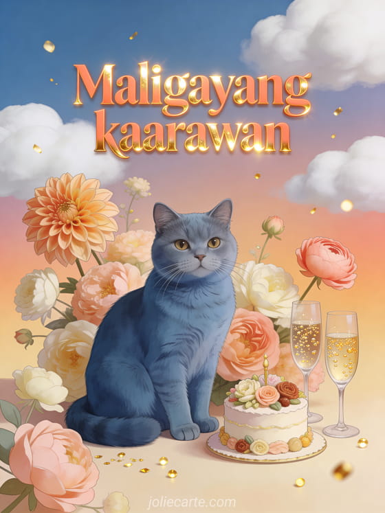 Ipagdiwang ang kaarawan ng iyong anak na babae gamit ang eleganteng card na ito na may coral na dahlia, ranunculus, isang Russian blue na pusa at isang cake na dekorado ng mga bulaklak. Tuklasin din ang isang magandang birthday card para sa batang babae o isang birthday card para sa aking anak na babae.