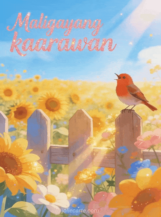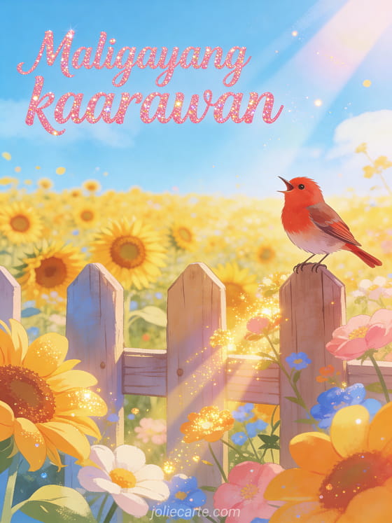Ipagdiwang ang isang kaarawan gamit ang masayang card na ito na may maliwanag na bukid ng sunflower sa ilalim ng asul na kalangitan ng tag-init, isang robin na nakatayo sa wooden fence na masayang umaawit at mainit na sinag ng araw. Tuklasin din ang birthday card na may bulaklak gif o ang musical birthday gif.