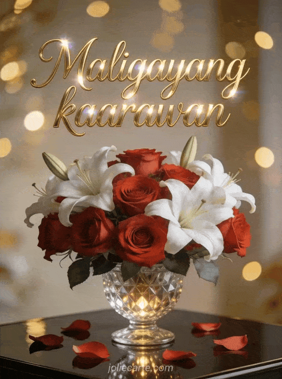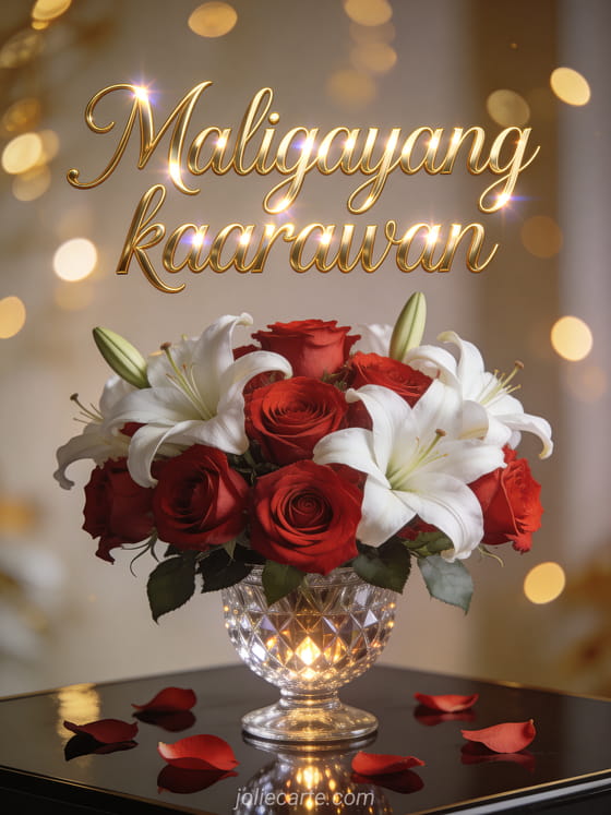 Ipagdiwang ang isang espesyal na kaarawan gamit ang magandang card na ito na may kahanga-hangang ayos ng mga pulang rosas at puting lilyo sa kristal na plorera, nagkalat na petals at gintong bokeh lights. Tuklasin din ang musical birthday gif o ang birthday card na may wildflowers.