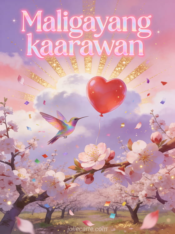 Ipagdiwang ang isang espesyal na kaarawan gamit ang kaibig-ibig na card na ito na may namumulaklak na plum tree orchard sa ilalim ng pastel na kalangitan, isang kumikinang na hummingbird at pulang heart balloon na lumulutang sa mga sanga. Tuklasin din ang libreng maligayang kaarawan na imahe o ang kaarawan gif na may bulaklak.