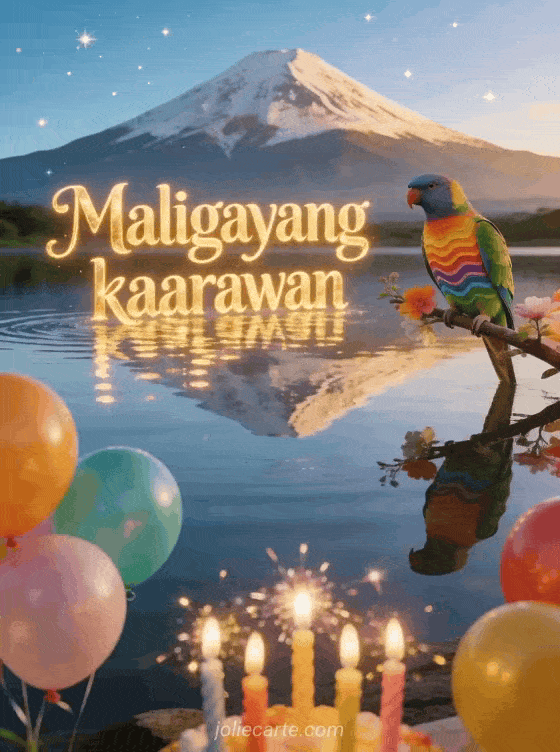Ipagdiwang ang isang espesyal na araw gamit ang magandang animated na birthday card na ito na may salaming lawa na may perpektong repleksyon ng bundok, isang makulay na budgerigar sa isang namumulaklak na sanga at kumikislap na mga kandila ng kaarawan na may mga makulay na lobo. Tuklasin din ang isang animated na birthday card o isang musikal na animated na birthday card.