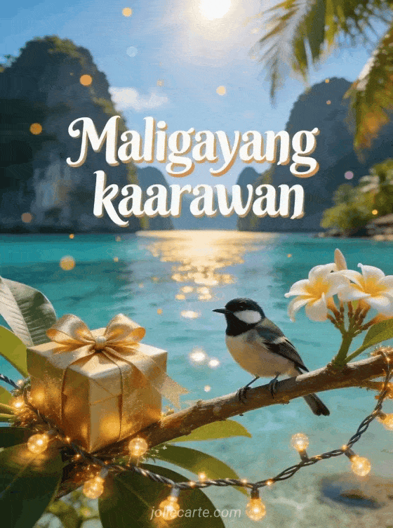 Pasayahin ang espesyal na araw ng isang mahal sa buhay gamit ang magandang animated na birthday card na ito na may turkesa na tropikal na lagoon, isang great tit na nakapatong sa mga bulaklak na frangipani at ginintuang mga sinag ng liwanag sa tubig. Tuklasin din ang isang musikal na animated na birthday card o isang magandang animated na birthday card.