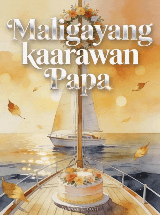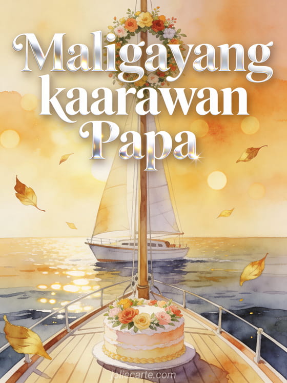 Ipagdiwang ang kaarawan ng iyong Papa gamit ang eleganteng card na ito na may bangkang layag sa tahimik na dagat sa paglubog ng araw, cake na may bulaklak sa kubyerta at gintong dahon na lumilipad sa hangin. Tuklasin din ang birthday card para sa Papa o ang birthday card mahal na Papa.