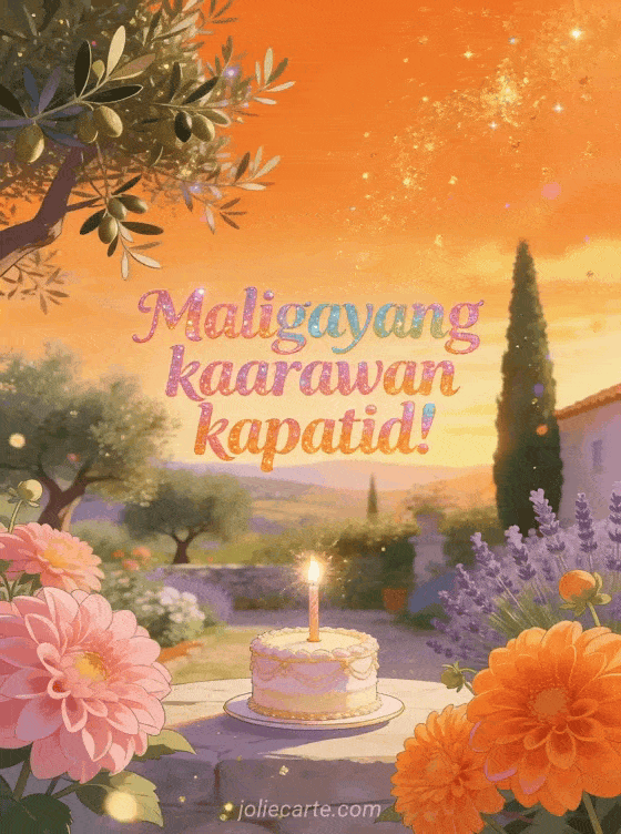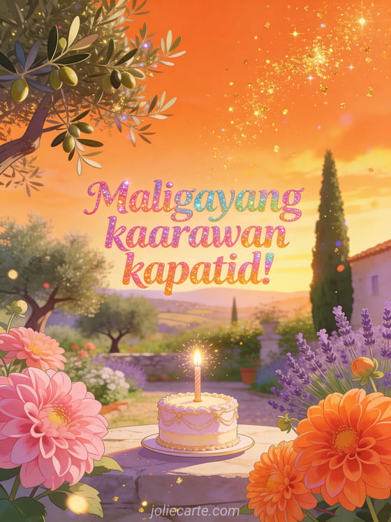 Ipagdiwang ang kaarawan ng iyong kapatid gamit ang magandang card na ito na may Mediterranean garden na naliligo sa gintong liwanag ng paglubog ng araw, namumulaklak na dahlia at kumikinang na birthday cake. Tuklasin din ang birthday card para sa kapatid o ang birthday drawing para sa kapatid.