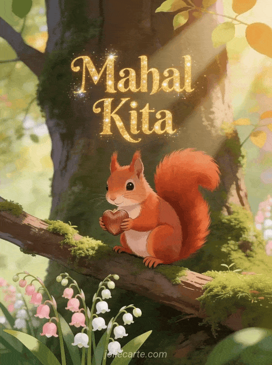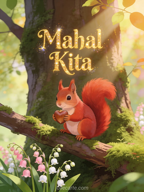 Magpadala ng adorable na greeting card na may cute na pulang ardilya na may hawak na acorn na hugis puso sa isang spring na kagubatan na may lily of the valley. Tuklasin din ang card mahal kita na may mga puso o ang card mahal din kita.