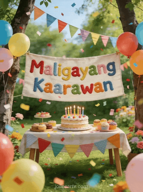 Magpadala ng masayang birthday card na may garden party na may makulay na banderitas, helium balloon at magandang dekoradong cake na may kandila. Perpekto para ipagdiwang ang kaarawan ng isang bata sa labas. Tuklasin din ang nakakatawang birthday card para sa mga bata o isang birthday card na may mga tuta.