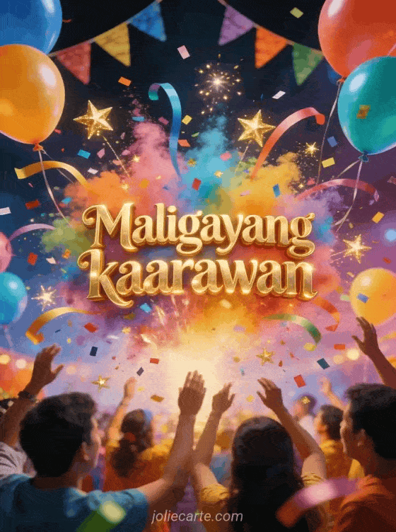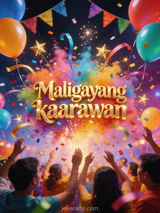 Ipagdiwang ang kaarawan gamit ang makulay na card na ito na may gintong letra, pagsabog ng makulay na confetti at serpentina, makulay na lobo at kumikislap na gintong bituin. Tuklasin din ang kaarawan card na may golden retriever o isang kaarawan card na may pusa.
