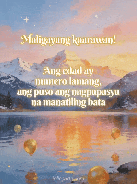 Ipagdiwang ang isang kaarawan gamit ang nakapagbibigay-inspirasyong sipi tungkol sa pagiging bata sa puso. Tuklasin din ang isang sipi tungkol sa panahong lumilipas sa kaarawan, isang magandang kaarawan ecard o isang minimalist na kaarawan ecard.