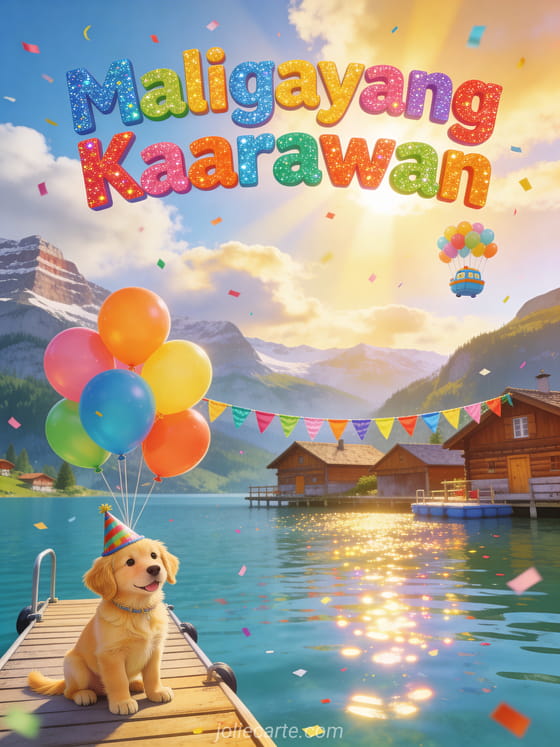 Ipagdiwang ang isang kaarawan gamit ang makukulay na card na ito na nagpapakita ng kaibig-ibig na golden retriever puppy na may sombrero ng party, nakaupo sa pantalan sa tabi ng Swiss alpine lake na may mga kahoy na chalet, makukulay na mga lobo na lumutang sa kalangitan, mga banderita at confetti. Tuklasin din ang birthday card na may rosas at paru-paro o isang mahiwagang birthday card.