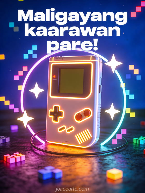 Ipadala ang astig na gaming na pagbati ng kaarawan na ito upang ipagdiwang ang espesyal na araw ng isang gamer na may neon style. Tuklasin din ang kard ng kaarawan para sa tinedyer na lalaki o ang pagbati ng kaarawan para sa tinedyer na babae o ang mensahe ng kaarawan para sa tinedyer.
