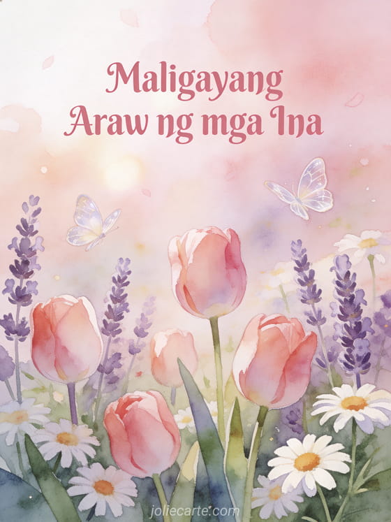 Ipagdiwang ang Araw ng mga Ina gamit ang magandang libreng greeting card na ito. Isang malambot na watercolor na ilustrasyon ng isang hardin sa tagsibol na puno ng tulip, lavender at daisy na naliligo sa mainit na liwanag, na may mga paru-paro na sumisayaw sa pagitan ng mga bulaklak. Tuklasin din ang isang card para sa Araw ng mga Ina, isang card na may mga larawan para sa Araw ng mga Ina o isang card na may mga larawan para sa nanay.