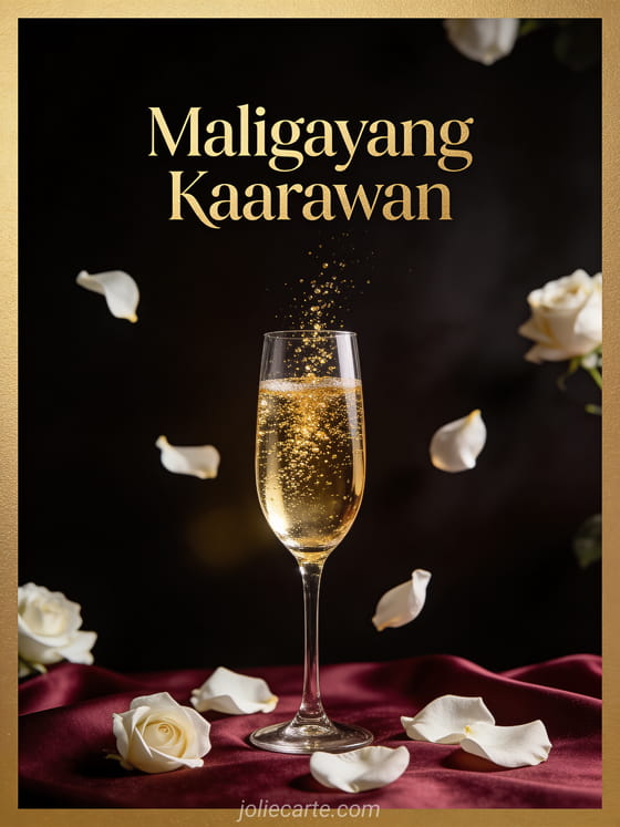 Batiin siya ng maligayang kaarawan gamit ang sopistikadong card na ito na may copa ng champagne na may gintong bula at petals ng puting rosas sa mainit na kapaligiran. Tuklasin din ang isang card ng kaarawan na may paru-paro o isang card ng kaarawan na may pusa.