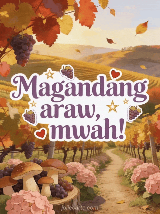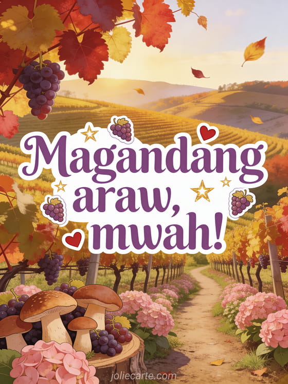 Pasayahin ang araw ng isang tao gamit ang mainit na card na ito na may mga ubasang burol sa taglagas, pula at gintong dahon ng ubas, rosas na hydrangea at gintong liwanag. Tuklasin din ang isang animated na good morning card o isang good morning card na may araw.