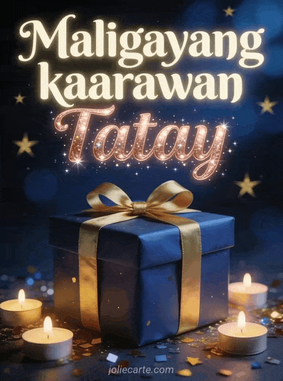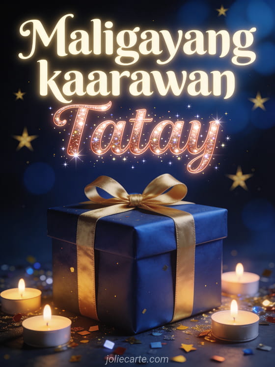 Ipagdiwang ang kaarawan ng iyong tatay gamit ang eleganteng libreng kartang ito na may magandang regalo na kulay asul ng gabi na may gintong laso, mga nagniningas na kandila, kumikislap na confetti at gintong bituin. Tuklasin din ang karta ng kaarawan para sa tatay o karta ng kaarawan para sa tatay.