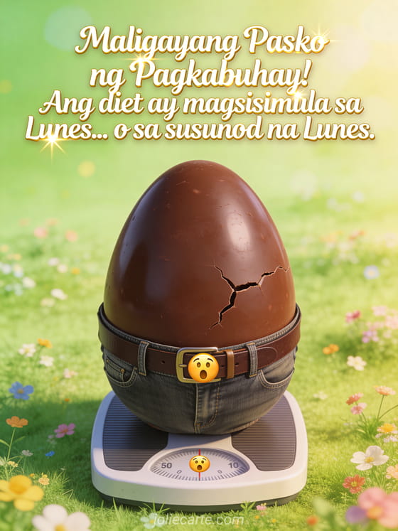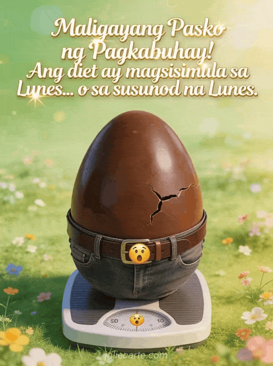 Magpadala ng nakakatawang GIF ng Pasko ng Pagkabuhay na may malaking tsokolate na itlog na hindi na kasya sa sinturon nito. Ang diet ay magsisimula sa Lunes... o sa susunod na Lunes. Tuklasin din ang nakakatawang card ng Pasko ng Pagkabuhay o nakakatawang larawan ng Pasko ng Pagkabuhay at masayang card ng Pasko ng Pagkabuhay.