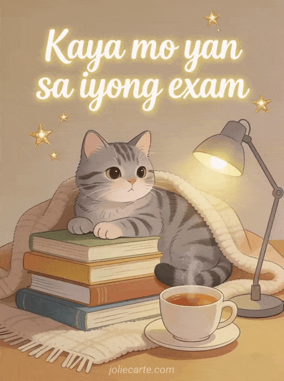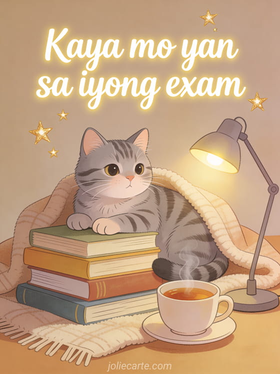 Pasayahin ang pag-aaral gamit ang adorableng card na ito na may pusang tabby na nakahiga sa tabi ng mga libro at mainit na tsa. Tuklasin din ang animadong card para sa exam.