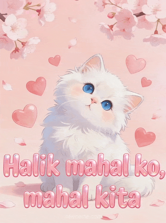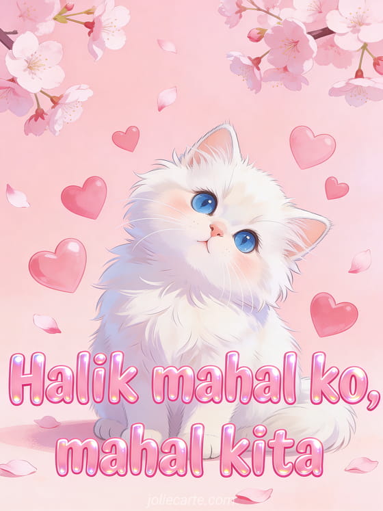 Magpadala ng matamis na halik sa iyong mahal sa cute na card na ito na may puting Persian kitten na napapaligiran ng mga pink na puso at cherry blossom petals. Tuklasin din ang magandang love card o isang cute love card.