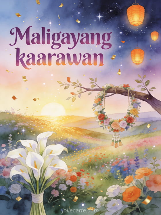 Ipagdiwang ang isang kaarawan gamit ang pangarap na card na ito na may namumulaklak na lambak sa gintong sunrise na may eleganteng calla lily, festive na korona ng bulaklak, gintong confetti, at mga orange na parol na lumulutang sa gabing langit. Tuklasin din ang animated kaarawan card para sa lalaki o ang kaarawan card para sa lalaki.