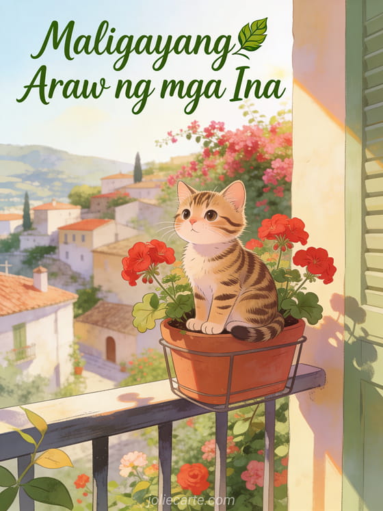 Ipagdiwang ang nanay gamit ang masayang libreng greeting card na ito. Isang magandang ilustrasyon ng isang tabby na pusa na nakaupo sa isang paso ng pulang geranium sa isang maaraw na balkonahe na may tanawin ng isang Mediterranean na nayon, na may bougainvillea sa likuran. Tuklasin din ang isang card na may mga litrato para sa Araw ng mga Ina, isang card na may bulaklak para sa Araw ng mga Ina o isang card para sa Araw ng mga Ina.