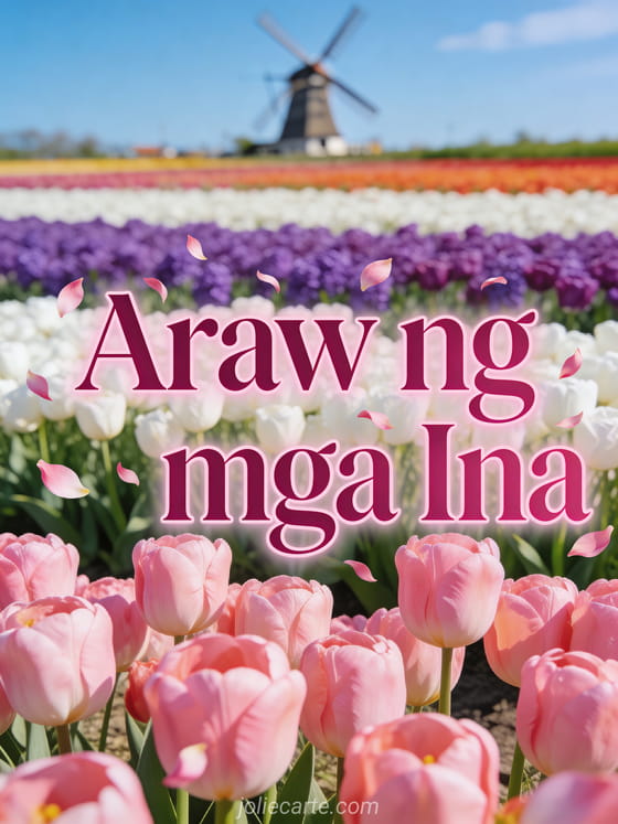 Ipagdiwang ang Araw ng mga Ina gamit ang makulay na libreng greeting card na ito. Isang photorealistic na tanawin ng mga hanay ng rosas, puti at lila na tulip sa isang Dutch garden na may windmill na malabo sa likuran sa ilalim ng asul na langit ng tagsibol. Tuklasin din ang isang libreng card para sa Araw ng mga Ina, isang card na may mga litrato para sa Araw ng mga Ina o isang card na may bulaklak para sa Araw ng mga Ina.