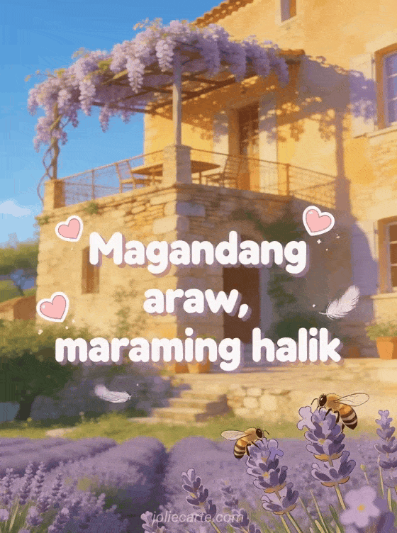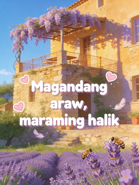 Pasayahin ang araw gamit ang card na ito na may gintong bato na Provencal na bahay, lavender field, wisteria at maliliit na bubuyog sa mainit na gintong liwanag. Tuklasin din ang isang good morning card o isang virtual na good morning card.