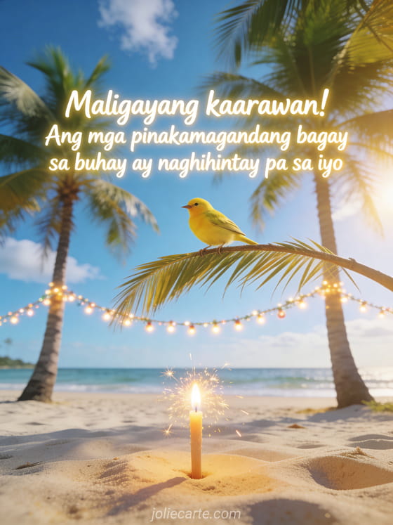 Pasayahin ang kaarawan ng isang tao gamit ang mainit na pagbati na ito na nagpapaalala na ang mga pinakamagandang bagay sa buhay ay naghihintay pa. Tuklasin din ang birthday card tamasahin bawat sandali o ang birthday card magandang ugali o ang birthday ecard.