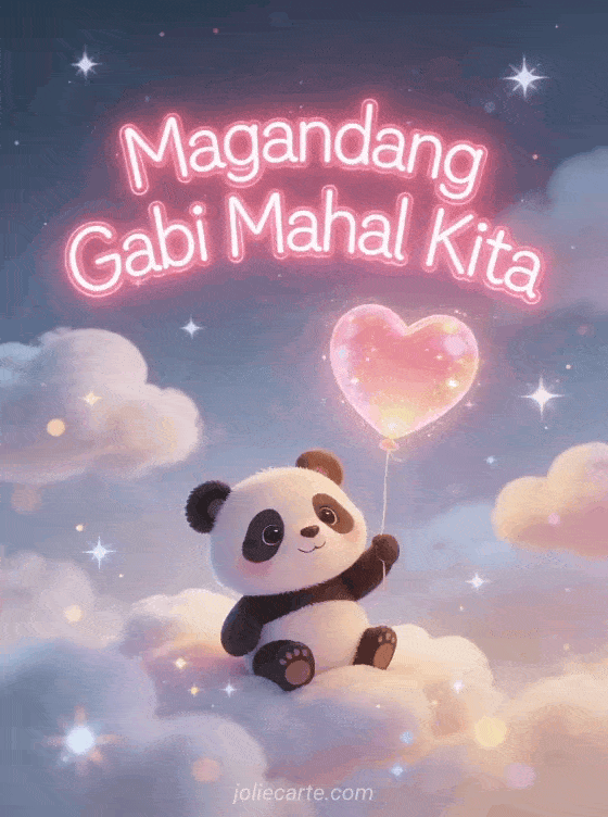 Bumati ng magandang gabi sa iyong mahal sa adorable card na ito na may cute na cartoon panda na may kumikinang na heart balloon sa gitna ng ulap at bituin. Tuklasin din ang romantikong good night card o isang good night mahal ko card.