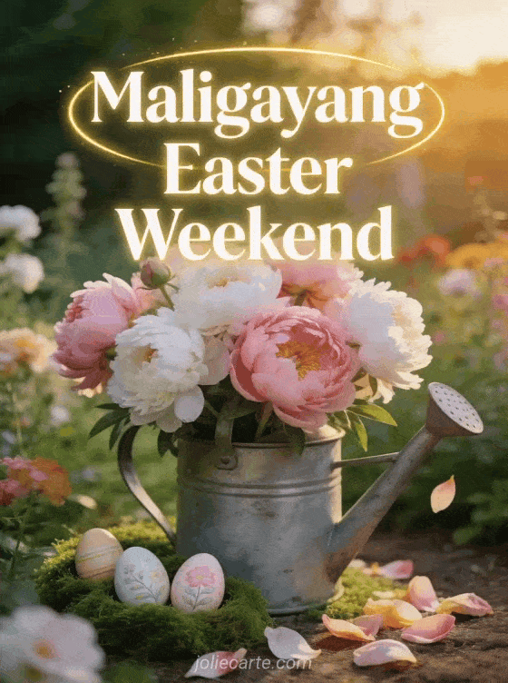 Batiin ang maligayang Easter weekend gamit ang romantikong card na may mga peony sa vintage na pandilig, mga itlog ng Pasko ng Pagkabuhay na pininturahan sa kamay, at gintong liwanag ng paglubog ng araw. Tuklasin din ang card ng Easter weekend, pagbati ng Easter weekend, o maligayang Easter weekend sa lahat.