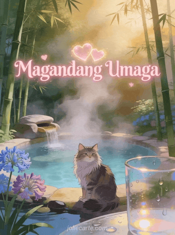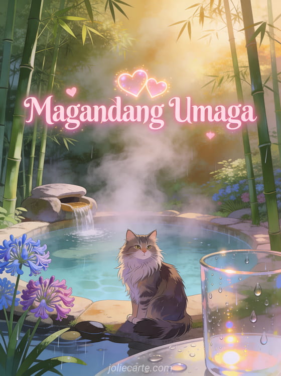 Magpadala ng malambot na Magandang Umaga na bati na may maringal na Maine Coon na pusa sa tabi ng mainit na bukal na napapaligiran ng agapanthus. Tuklasin din ang isang Magandang Umaga bulaklak card o isang Magandang Umaga card.