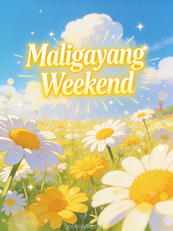 Magpadala ng masayang maligayang weekend na bati para pasayahin ang araw ng isang tao. Isang magandang parang ng tag-init na puno ng puti at dilaw na mga daisy sa ilalim ng asul na langit na may malalambot na ulap, naliligo sa maliwanag na sikat ng araw. Tuklasin din ang masayang weekend na card na may raccoon o ang weekend na card na may hardin.